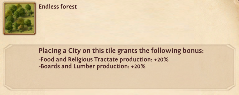 Tile bonuses are calculated by adding together adjacent tiles and the bonuses that they grant. For instance, if your City is surrounded by Forests, you'll have a 90% bonus production to Lumber. However, if in this scenario, one of the adjacent tiles is a Plain, you'll receive an 80% bonus to Lumber production and a 10% bonus to Food production.