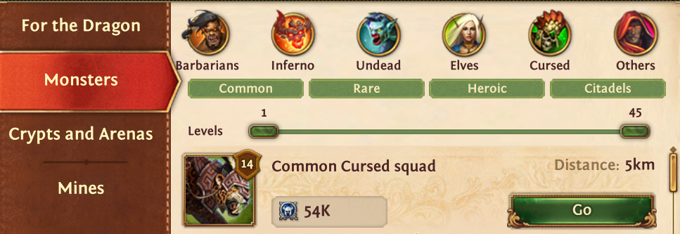 The common monsters' level depends on the level of your strongest Captain, and the rare monsters' level depends on the level of your Hero.