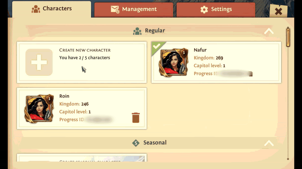 Сезонные прогрессы отображаются во вкладке "Сезонные", а постсезонные отмечены номером Сезонного Королевства, в котором они были созданы.